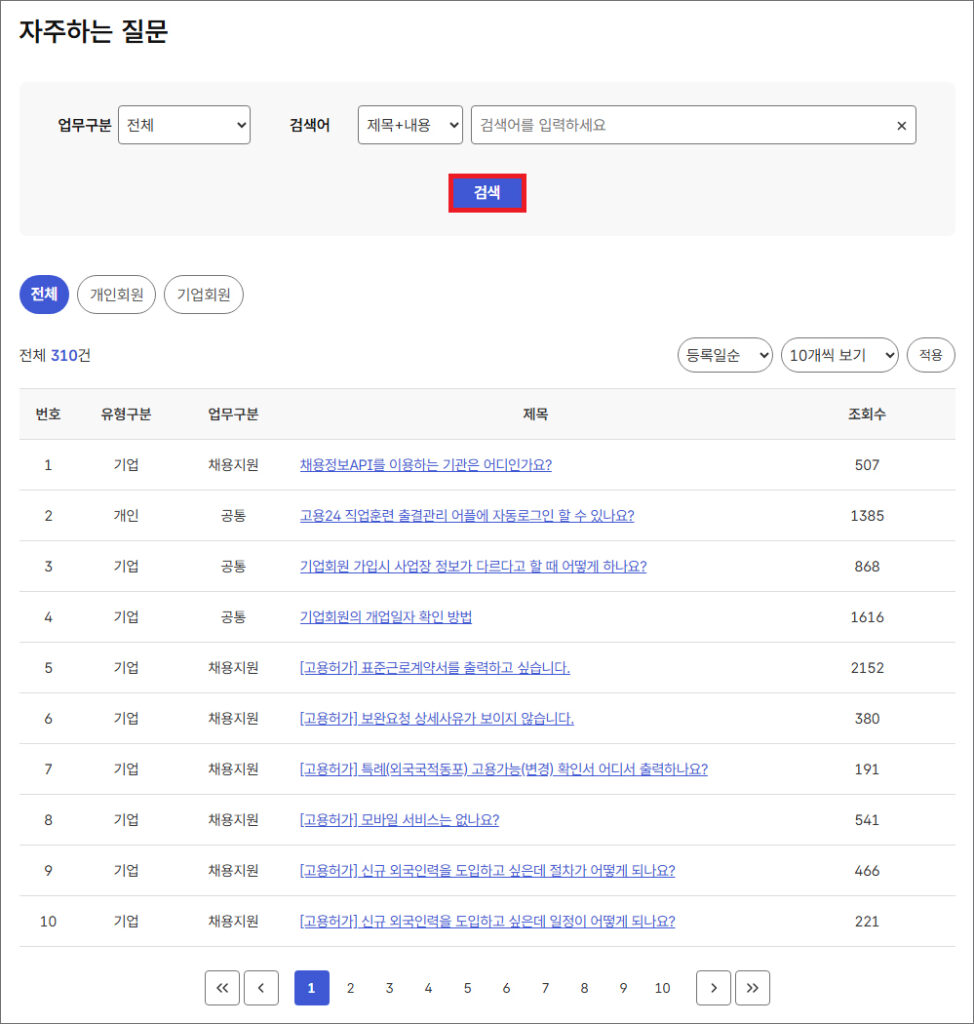 업무구분 옆에 전체 목록을 눌러 선택하고 검색어를 입력 후 [검색] 버튼을 누르면 궁금한 질문에 답변된 내용을 확인할 수 있습니다.