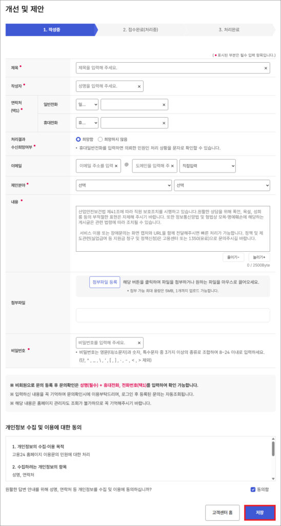 작성중> 접수완료(처리중)> 처리완료의 단계적인 과정으로 입력 및 선택하고 저장 후 접수하면 순차적으로 확인하여 답변을 드릴 테니 나중에 확인해 보시면 되겠습니다.