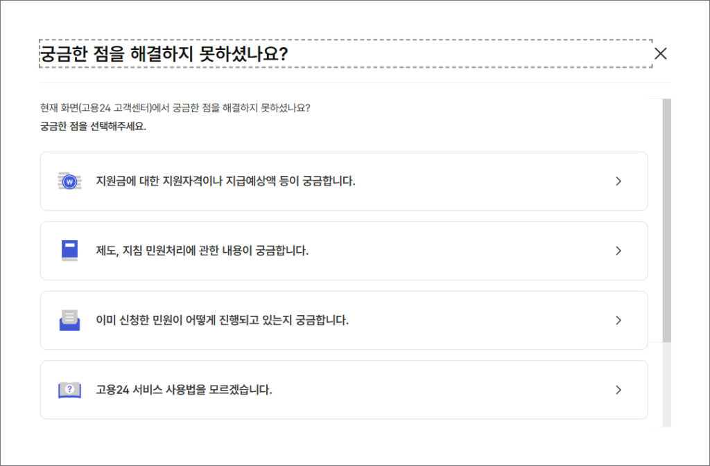 이럴 때 고용24 홈페이지를 이용하면 챗봇, 고객센터를 통해 자주 찾는 도움말, 문의, 개선 및 제안을 해보실 수 있습니다.
