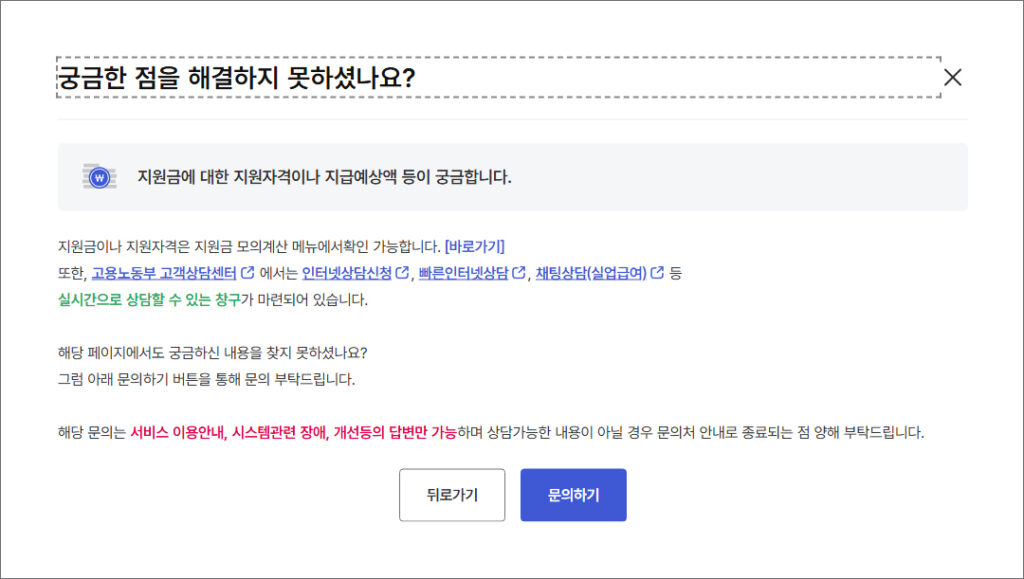 정책 및 제도 관련(실업급여 등 지원금 청구 및 정책신청)은 고용센터 또는 1350(유료)로 전화해서 문의하시면 되니 연락해 보세요.