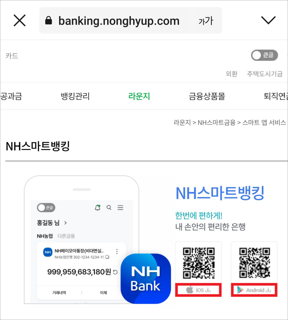 아직 NH스마트뱅킹이 깔려있지 않으신 분들은 구글 Play 스토어, 아이폰 앱스토어에서 ‘NH스마트뱅킹’ 검색 후 다운로드부터 진행해 주세요.