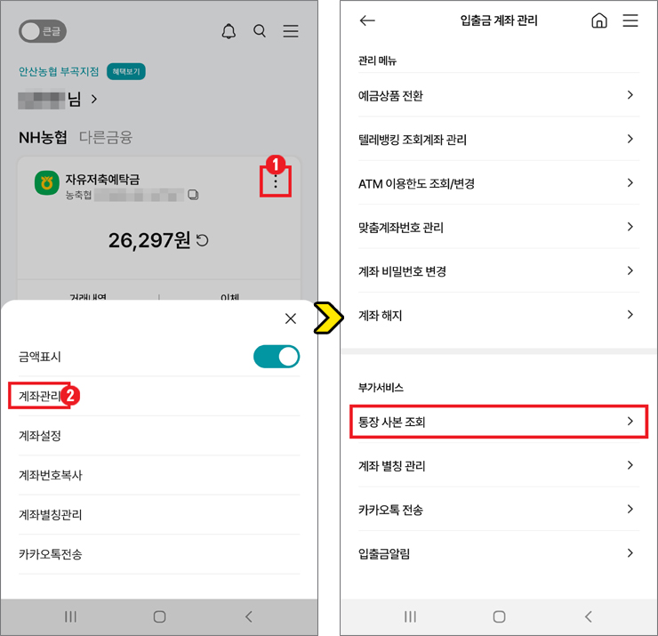 더보기 메뉴인 점 3개 표시를 터치한 다음 [계좌관리]를 눌러주세요.