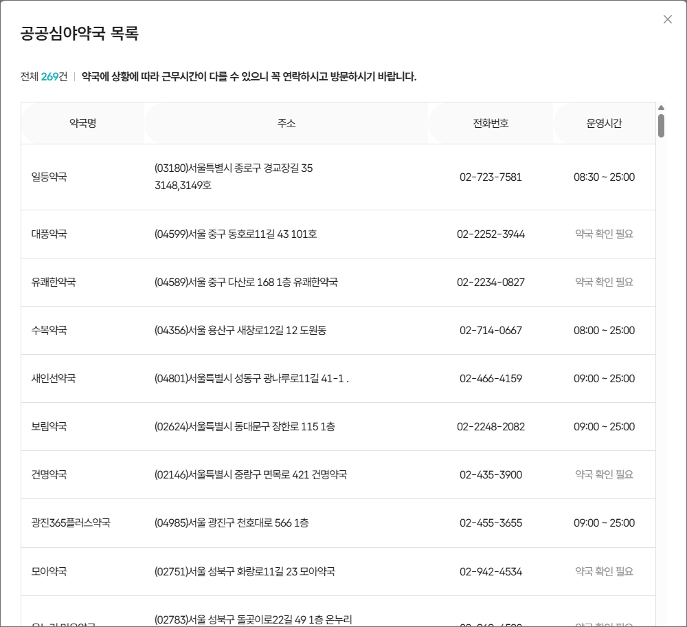 · 간판에 불이 켜져 있어도 휴게시간 등 약국 사정에 따라 문이 잠겨있는 경우도 있으니 방문 전 반드시 전화로 운영 여부를 확인하세요.