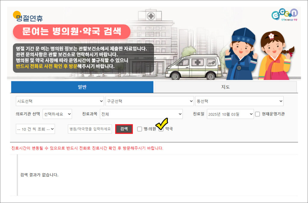 열린 화면에서 시도선택, 구군선택, 동선택을 하고 기본적으로 병·의원에 선택되어 있으니 해제하고 약국만 선택한 상태에서 [검색] 버튼을 누릅니다.
