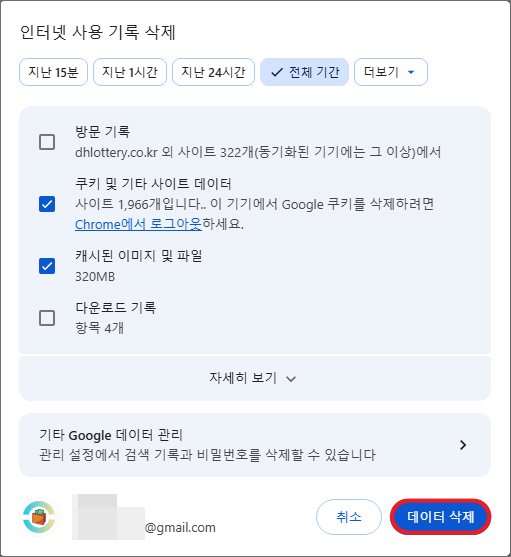 그러니 [인터넷 사용 기록 삭제]로 들어가서 쿠키 및 기타 사이트 데이터 또는 캐시된 이미지 및 파일을 삭제 후 다시 접속을 해보세요.