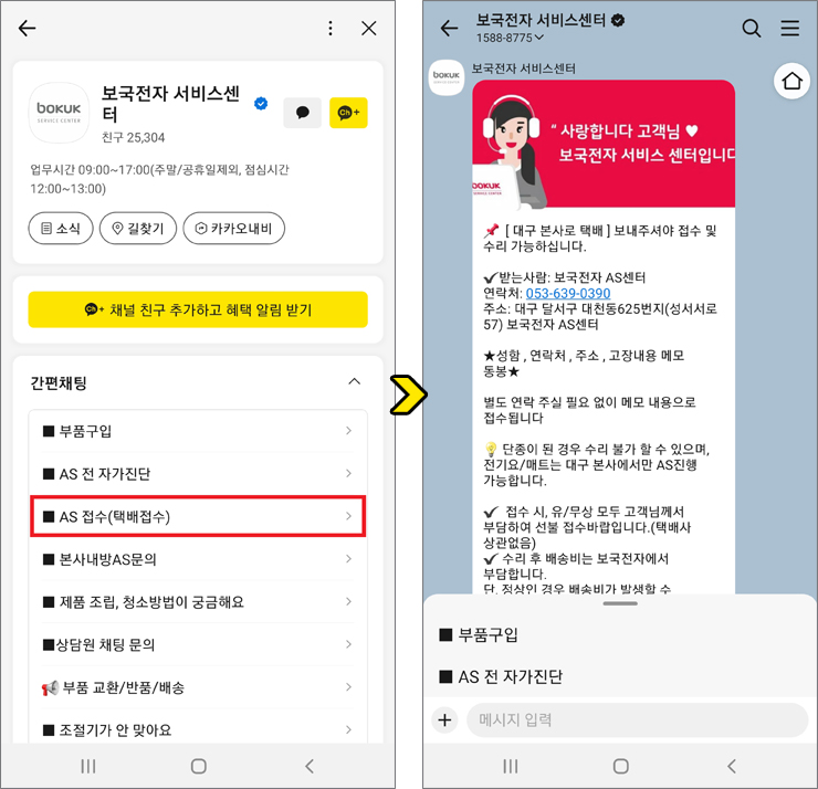 카카오톡 상담센터로 진입하여 간편채팅 중 AS 접수(택배접수) 항목을 선택할 경우 채팅방이 열리는데 안내된 내용에 따라 진행해 주시면 됩니다.