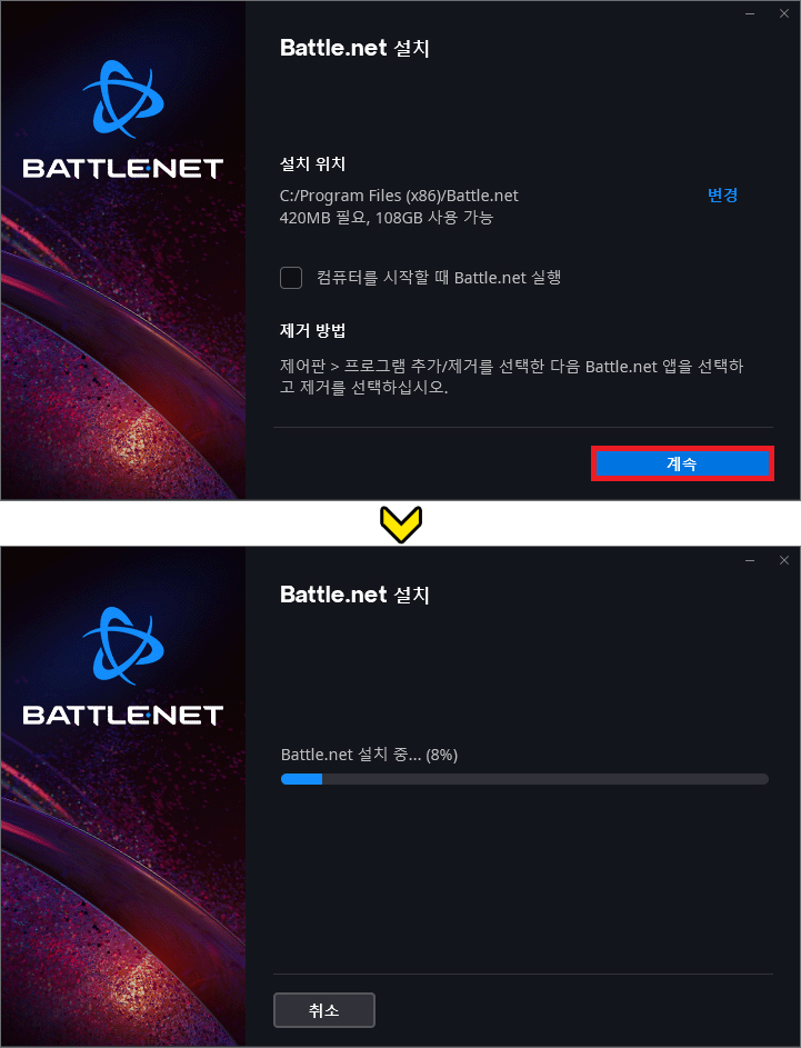 Battle.net 설치 창이 뜨면 설치 위치를 확인하고 선택되어 있는 항목이 불필요할 경우 해제하시면 되며 계속 진행하기 위해 [계속] 버튼을 눌러주세요.