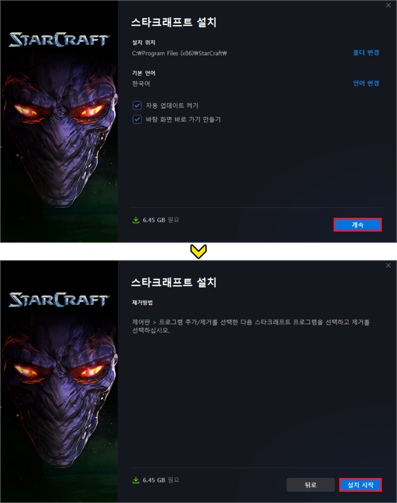 본격적인 스타크래프트1 다운로드를 위해 설치 창이 뜨면 설치 위치와 기본 언어를 확인하고 자동 업데이트 켜기, 바탕 화면 바로 가기 만들기 선택 여부를 결정한 후 [계속]> [설치 시작] 버튼을 누릅니다.