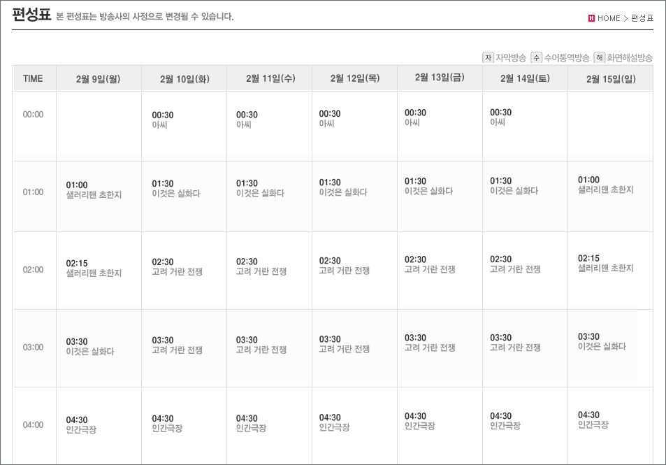 월요일부터 일요일까지, 00:00~23:00까지 어떤 프로그램이 방송하는지 정리되어 있으니 궁금하신 분들은 확인해 보시면 되겠습니다.(본 편성표는 방송사 사정으로 변경될 수 있음)