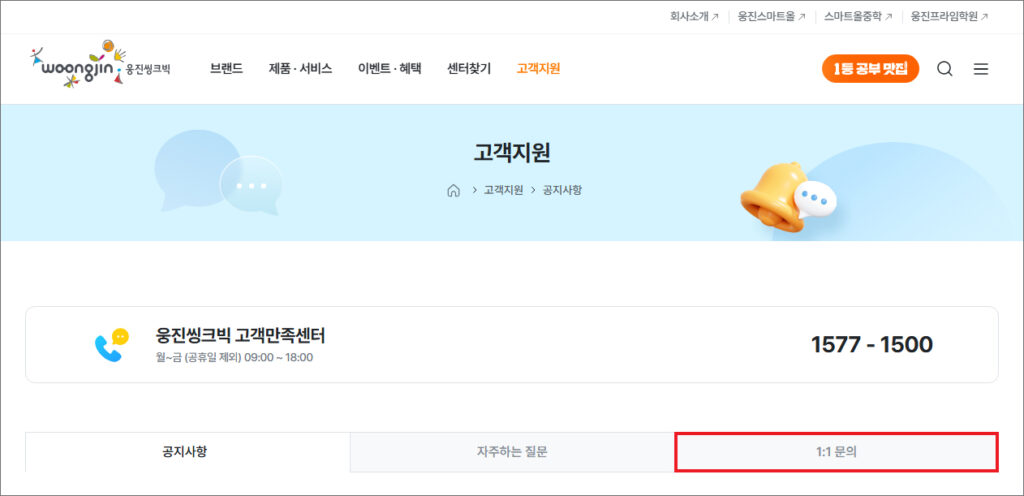 이럴 땐 웅진씽크빅 홈페이지에 들어가면 고객지원으로 자주하는 질문과 1:1 문의를 해보실 수 있으니 이용해 보시는 걸 추천드립니다.