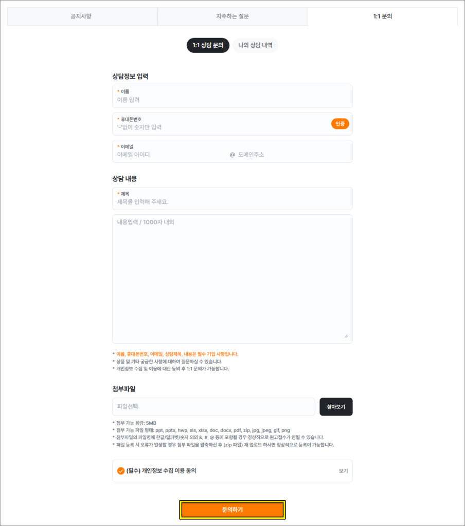 작성한 내용을 전체적으로 확인해 보시고 개인정보 수집 이용 동의 항목에 체크한 상태에서 [문의하기] 버튼을 눌러 접수할 수 있으니 진행하시면 되고요.