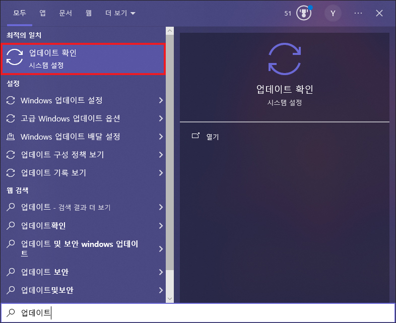 키보드 자판에서 윈도우키를 누르고 검색란에 업데이트를 입력한 다음 검색 결과 중 [업데이트 확인]을 클릭하세요.
