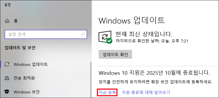 Windows 업데이트 화면이 나왔을 때 장치를 안전하게 유지하려면 확장 보안 업데이트에 등록하라고 나오는데 [지금 등록]을 클릭합니다.