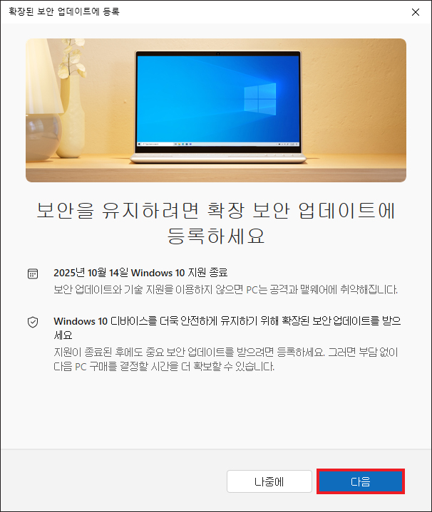확장된 보안 업데이트에 등록 창이 뜨는데 지원이 종료된 후에도 중요 보안 업데이트를 받으려면 등록으로 다음 PC 구매를 결정할 시간을 더 확보할 수 있으니 [다음] 버튼을 누르고 마이크로소프트 계정에 로그인합니다.