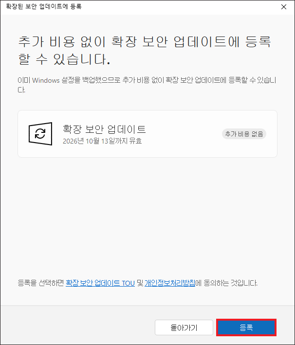MS 계정에 로그인되어 있다면 바로 다음 단계로 넘어가게 되는데 추가 비용 없이 확장 보안 업데이트에 등록할 수 있음을 알릴 테니 [등록] 버튼을 눌러주세요.