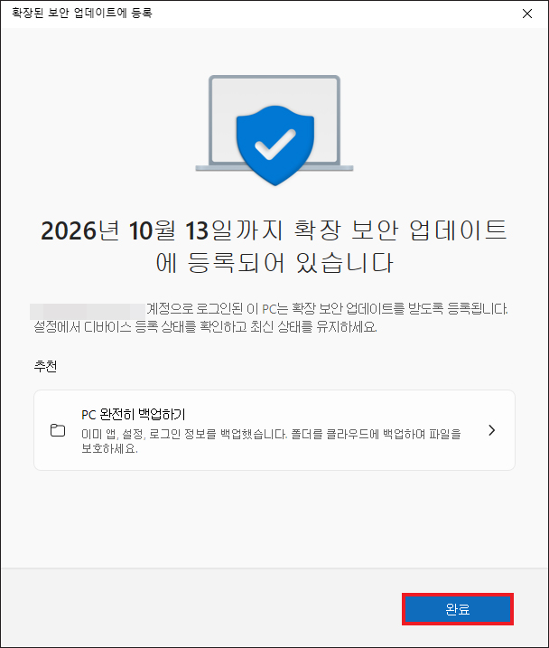 확장 보안 업데이트에 디바이스 등록을 완료하면 2026년 10월 13일까지 확장 보안 업데이트에 등록되었다고 나올 것이며 안전하게 연장해서 사용할 수 있으니 [완료] 버튼을 눌러 빠져나오시면 됩니다.