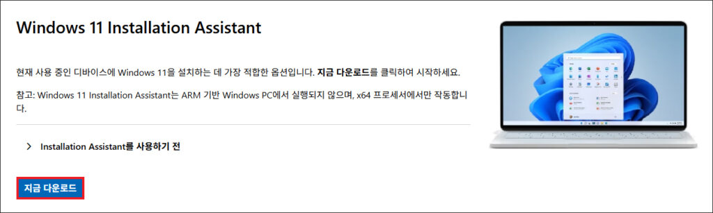 Windows 11 다운로드 페이지가 열린 상태에서 Windows 11 Installation Assistant 섹션에 있는 [지금 다운로드] 버튼을 눌러주세요.