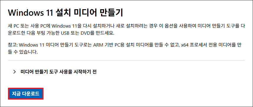 시작 전에 약 8GB 이상되는 용량의 USB 드라이브를 준비해 주시고 Windows 11 다운로드 페이지에서 스크롤을 조금만 내리면 Windows 11 설치 미디어 만들기 섹션에 [지금 다운로드] 버튼이 있으니 눌러주세요.