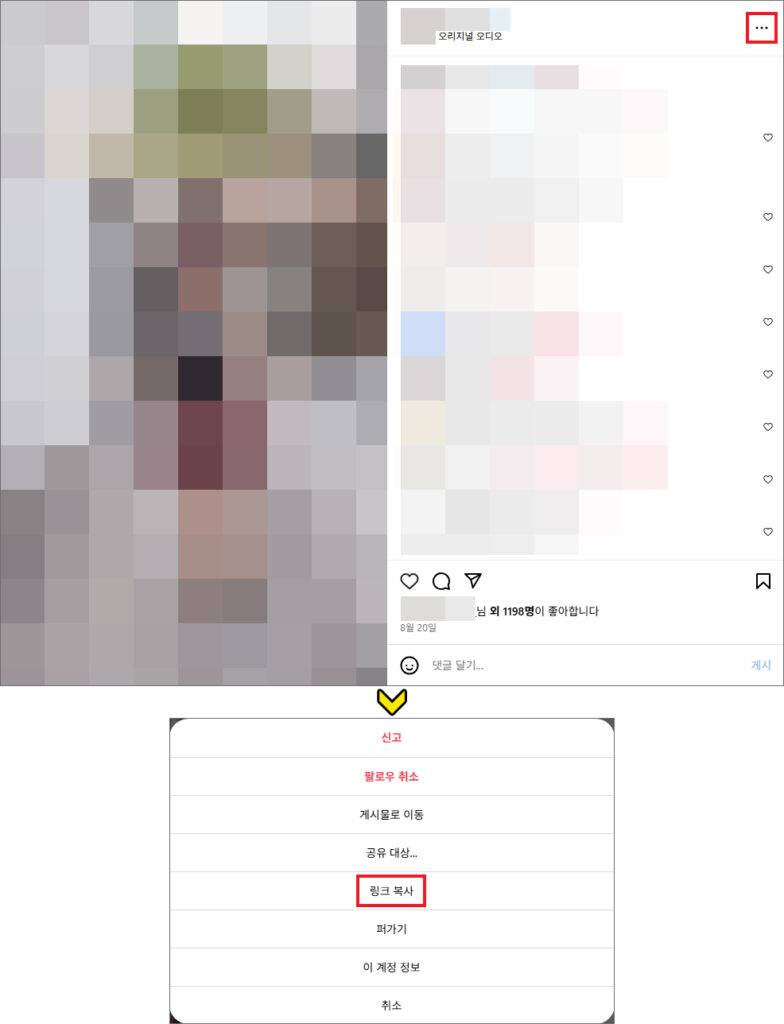 해당 게시물 우측 상단을 보면 점 3개 표시가 있으니 클릭하고 [링크 복사]를 선택합니다.