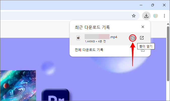 다운로드 알림 표시는 잠깐 떴다가 자동으로 사라지는데 사라져도 괜찮은 것이 우측 상단에 있는 아래 방향 화살표 아이콘을 클릭하면 방금 다운로드된 걸 찾을 수 있으니 폴더 모양을 클릭하면 됩니다.