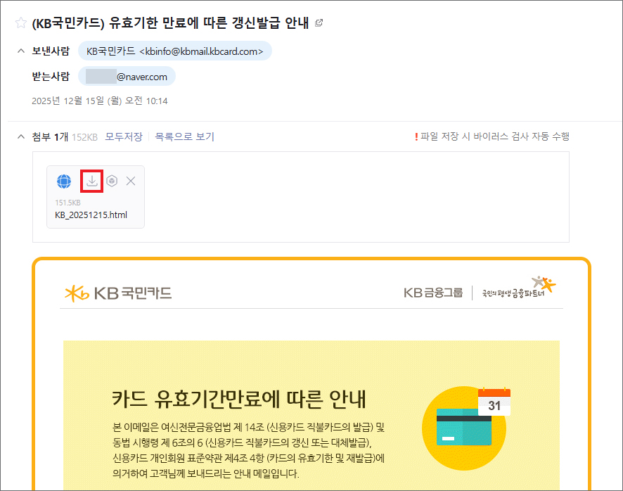 필자는 최근 카드 유효기간만료에 따른 안내 내용으로 보안 메일을 받았는데 관련 내용을 읽어보려면 첨부파일을 저장 후 실행하라고 나와있어서 확인을 해봤습니다.
