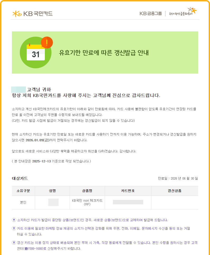 메일 내용을 읽어보니 소지하고 있는 KB국민체크카드의 유효기한이 만료됨에 따라 카드 사용에 불편이 없도록 고객의 별도 신청 없이 유효기간이 연장된 카드를 만료 월 이전에 우편물 수령지로 전달해 준다는 걸 알 수 있었습니다.