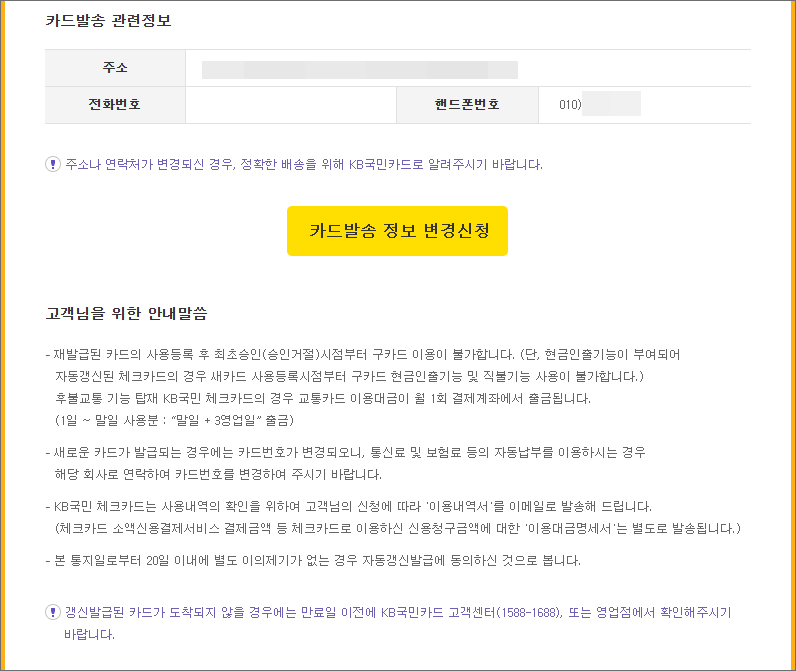카드 발송 관련정보에서 주소, 전화번호, 핸드폰번호 중 변경된 게 있다면 정확한 배송을 위해 KB국민카드로 알려주시면 되는데 [카드발송 정보 변경신청] 버튼을 눌러 진행할 수 있으니 참고해 주세요.