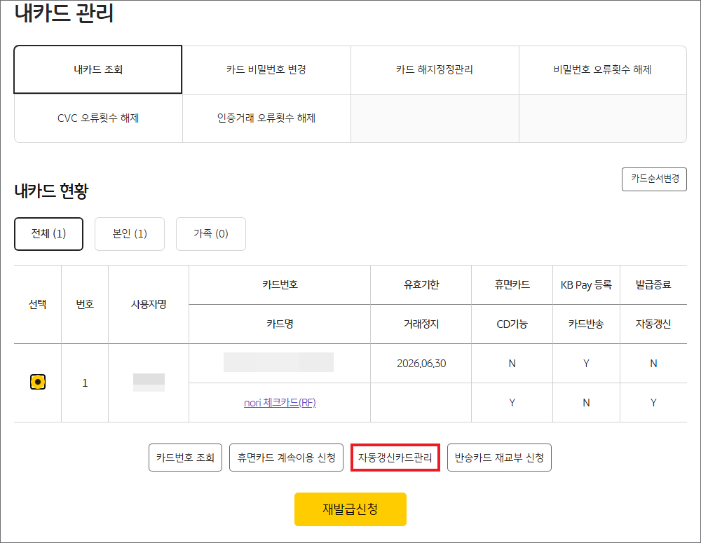 상단 메뉴 중 My KB에 마우스를 올리고 하위 메뉴에서 [내카드 관리]를 클릭하면 내카드 현황이 나오는데 해당 카드를 선택하고 [자동갱신카드관리]를 클릭합니다.