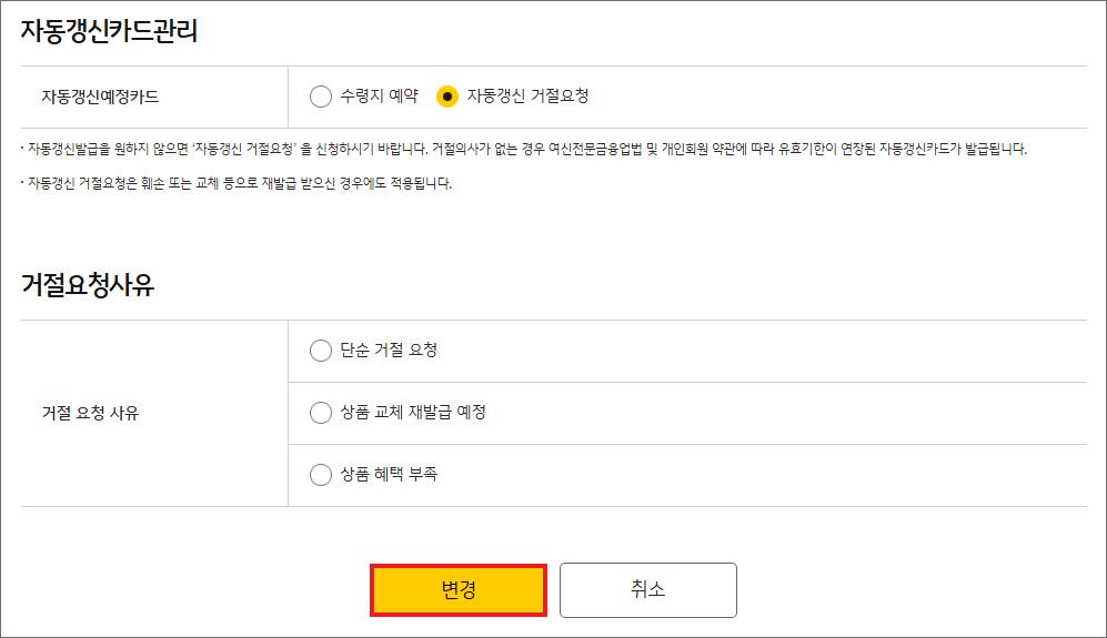 자동갱신예정카드에서 자동갱신 거절요청을 선택하고 거절요청사유는 단순 거절 요청, 상품 교체 재발급 예정, 상품 혜택 부족 중 해당되는 걸 선택 후 [변경] 버튼을 눌러주시면 될 거예요.