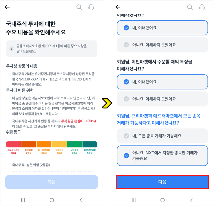 이어서 국내주식 투자에 대한 주요 내용을 확인하라고 나오는데 전체적으로 읽어본 후 확인이 필요한 부분에서 이해했음을 알리기 위해 모두 선택 후 [다음] 버튼을 눌러주세요.