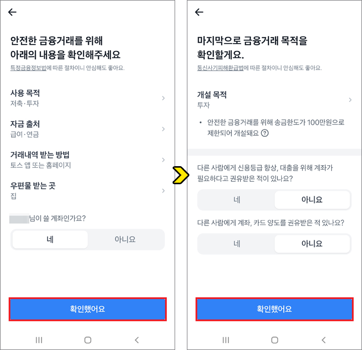 마지막으로 금융거래 목적을 위해 확인하게 되는데 ‘아니요’가 모두 선택된 상태에서 [확인했어요] 버튼을 누르면 토스증권 계좌가 만들어졌다고 알릴 테니 확인해 보시면 되겠습니다.