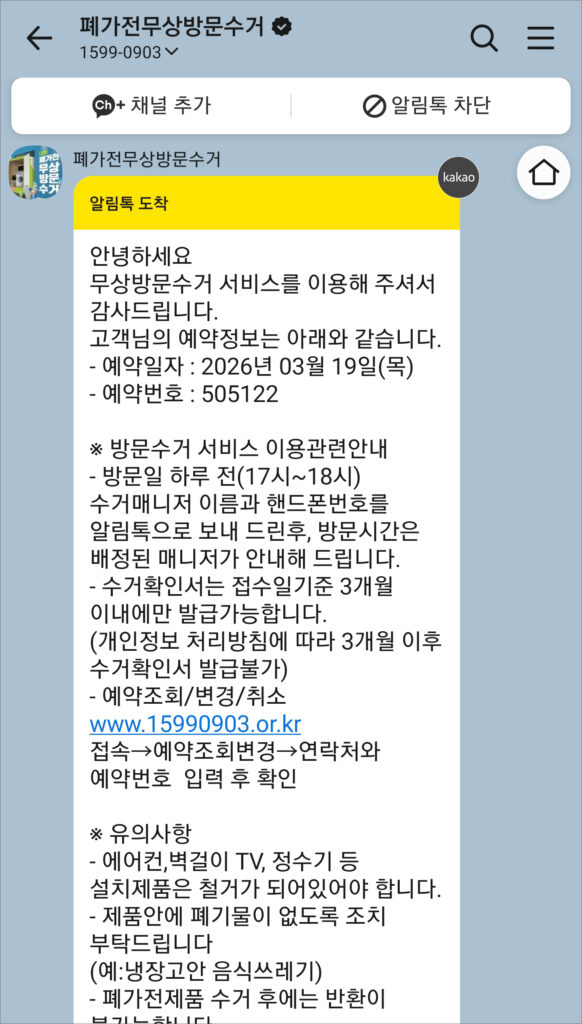 접수가 완료되면 폐가전무상방문수거 알림톡(카카오)이 오는데 예약정보를 확인하시고 방문수거 서비스 이용관련안내와 유의사항을 읽어보시면 될 거예요.