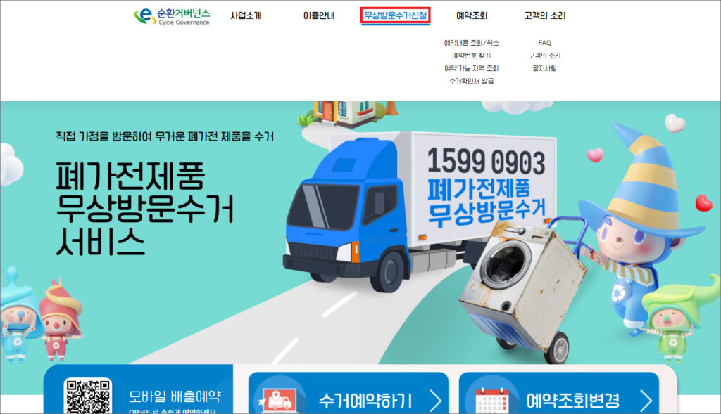 열린 화면에서 상단에 있는 메뉴 중 [무상방문수거신청]을 클릭합니다.