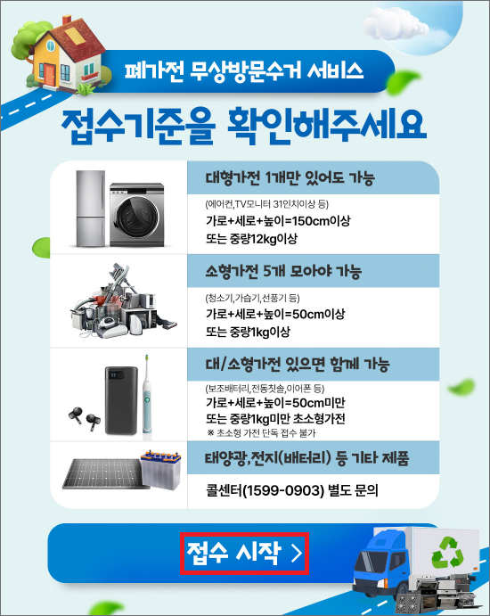 접수기준에 대해서 알려주는 내용이 나오는데 대형가전은 1개만 있어도 가능한 걸 알 수 있었어요.(에어컨, TV모니터 31인치 이상 등, 가로+세로+높이=150cm 이상 또는 중량 12kg 이상)
