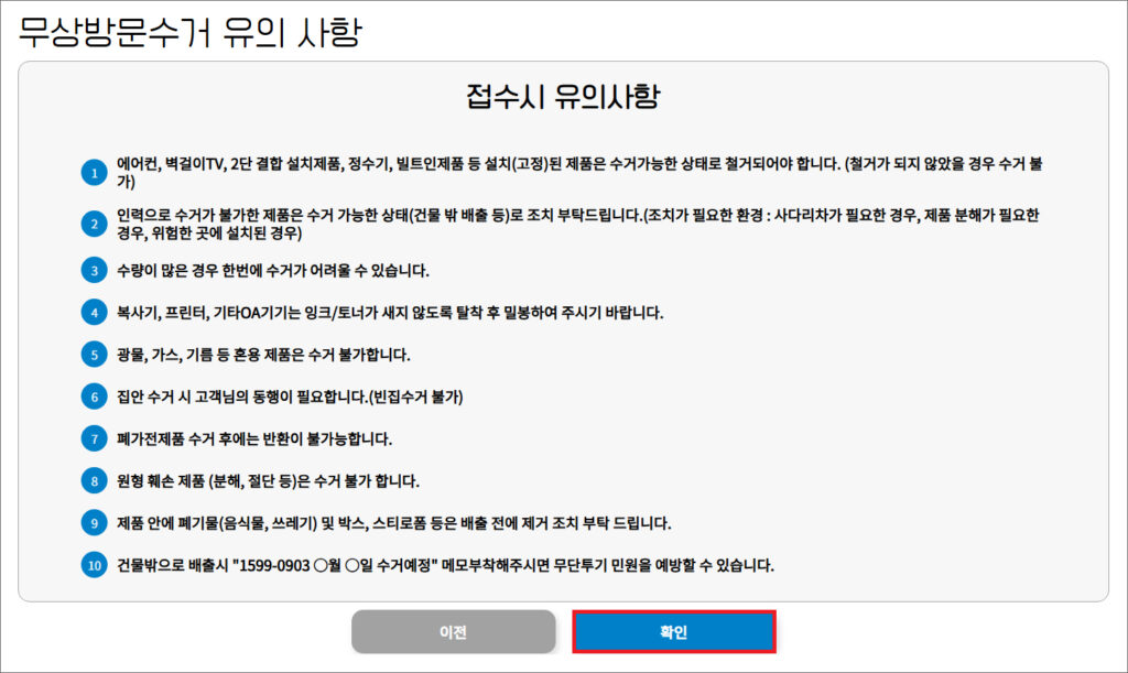 접수 시 유의사항을 알리는 내용이 나올 테니 읽어보시면 되는데 인력으로 수거할 수 없는 제품은 수거 가능한 상태로 조치를 취할 필요가 있습니다.