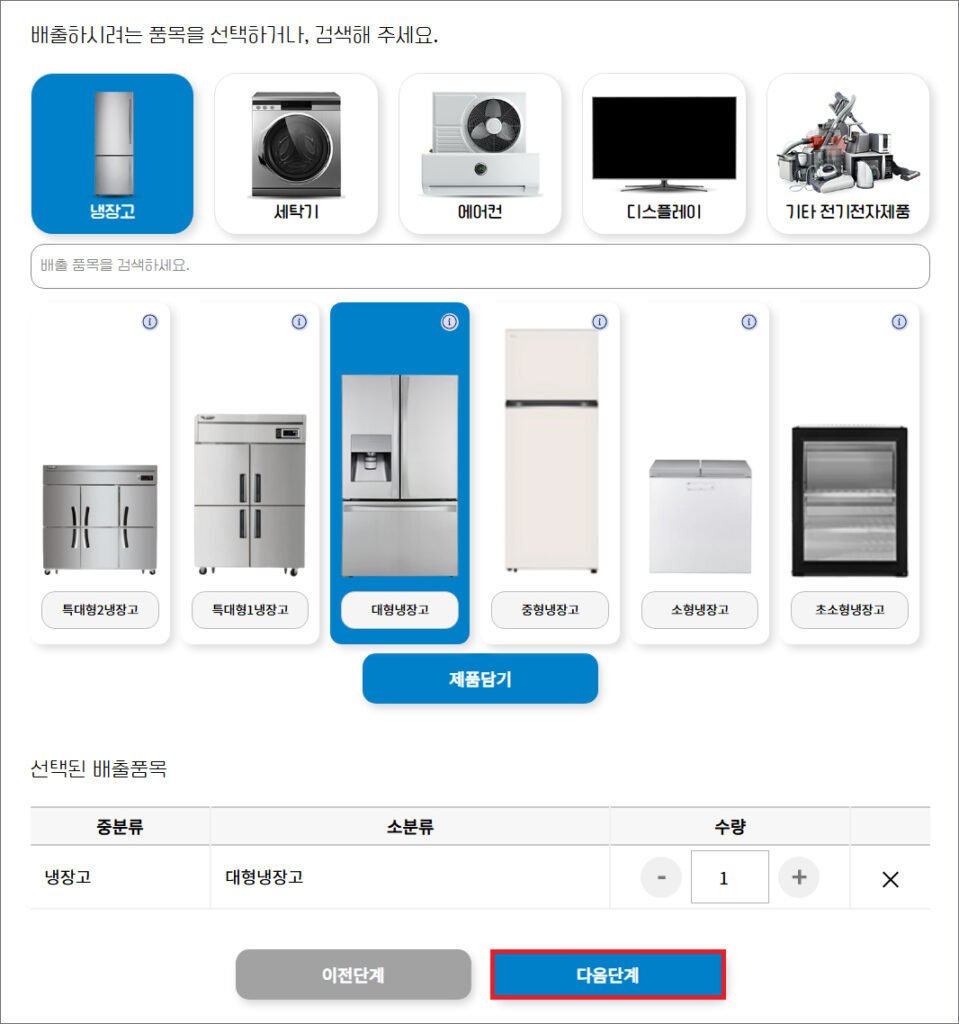 배출품목 입력으로 배출 품목을 선택하거나 검색 후 [제품담기] 버튼을 누르고 [다음단계] 버튼을 눌러주세요.