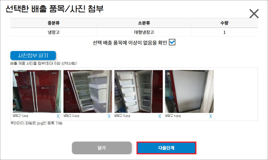 밑에 [사진첨부 하기] 버튼을 눌러 사진을 첨부(이미지 파일은 jpg만 등록 가능하며 최대 5장)하고 [다음단계] 버튼을 누릅니다.