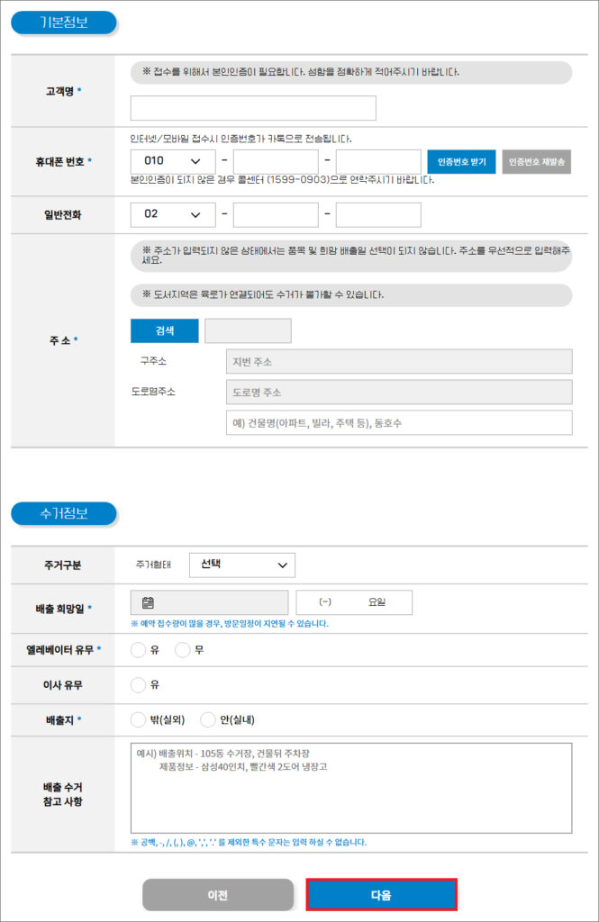 이후 기본정보 입력 및 본인인증을 해주시면 되는데 기본정보(고객명/휴대폰 번호/주소)와 수거정보(주거구분/배출 희망일/엘레베이터 유무/이사 유무/배출지/배출 수거 참고 사항)를 입력 후 [다음] 버튼을 눌러주세요.