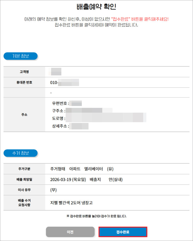 마지막은 배출예약 확인으로 입력한 정보를 다시 확인해서 이상 없으면 [접수완료] 버튼을 누른 다음 신청하겠냐고 물으면 [확인] 버튼을 누릅니다.
