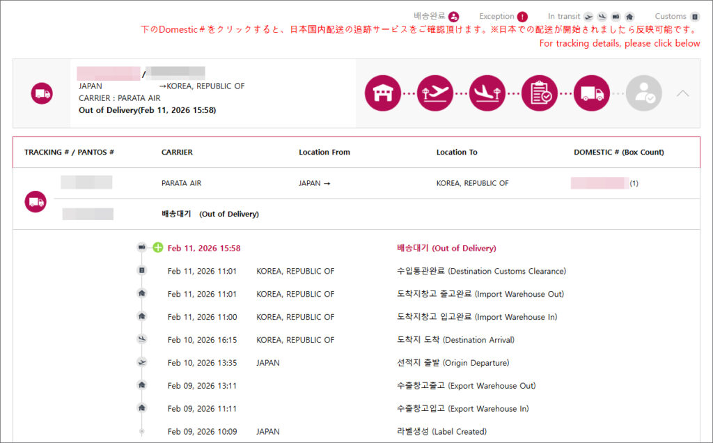 필자가 입력한 운송장 번호의 조회 결과를 확인해 보니 라벨 생성> 수출창고입고> 선적지 출발> 도착지 도착> 도착지창고 입고완료> 도착지 출고완료> 수입통관완료 후 배송대기 상태인 걸 알 수 있었어요.