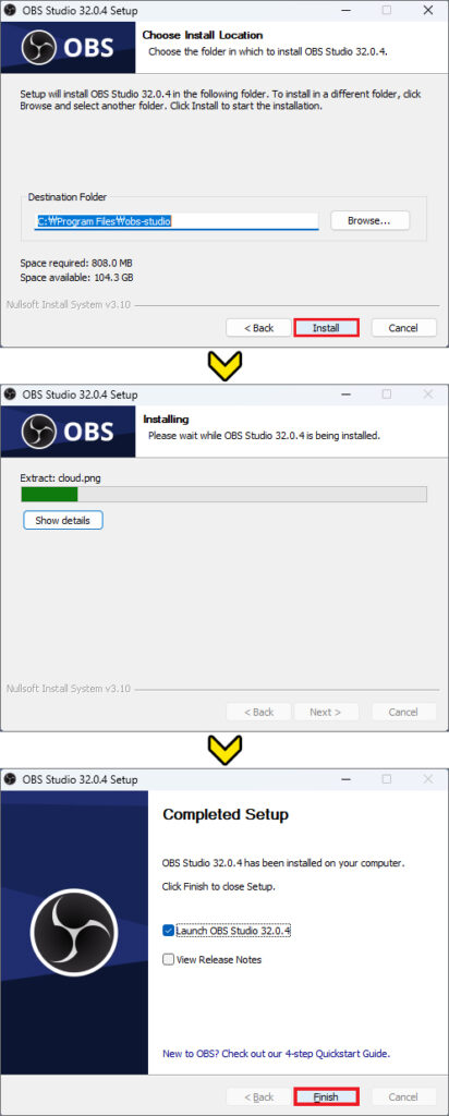 압축 해제가 시작될 테니 잠시만 기다려주시고 obs studio 설치가 완료되었음을 알리면 Launch OBS Studio 항목이 선택된 상태에서 [Finish] 버튼을 누릅니다.