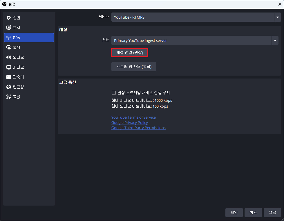 성공적으로 인증이 완료됐으면 다시 OBS 설정 화면으로 돌아와서 연결된 상태를 보고 이상 없으면 [확인] 버튼을 누릅니다.