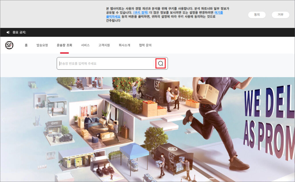열린 화면에서 상단에 있는 [운송장 조회] 메뉴에 마우스를 올리면 아래 운송장 번호 입력란이 나오는데 입력 후 돋보기 모양을 클릭하세요.