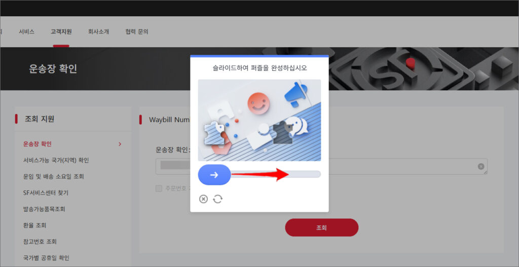 바뀐 화면은 조회 지원의 운송장 확인 페이지와 함께 작은 팝업 창이 같이 뜨는데 이는 그래픽 캡차가 로드로 인증 방식이라 생각하시면 됩니다.
