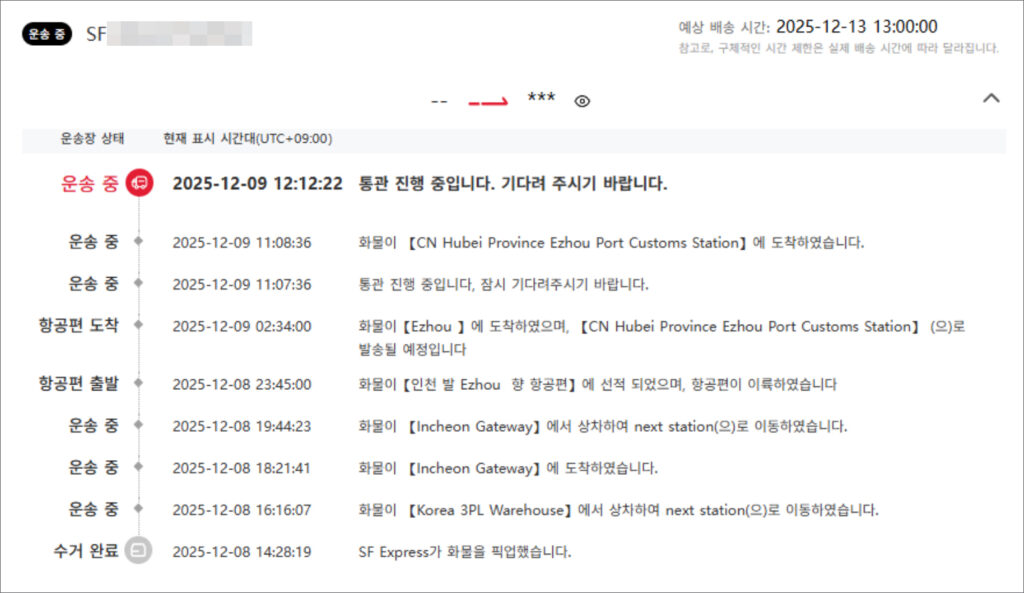 이후 sf express 배송조회로 운송중 상태, 현재 표시 시간대의 운송장 세부 정보를 볼 수 있었으니 궁금하신 분들은 확인해 보시면 될 거예요.