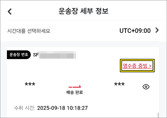 이럴 땐 운송장을 조회한 화면에서 우측을 보면 ‘영수증 증빙’이 있는데 클릭해서 수취인 전화번호 마지막 4자리를 입력하면 국내 배송사 송장이 노출될 테니 확인해 보시면 되겠습니다.