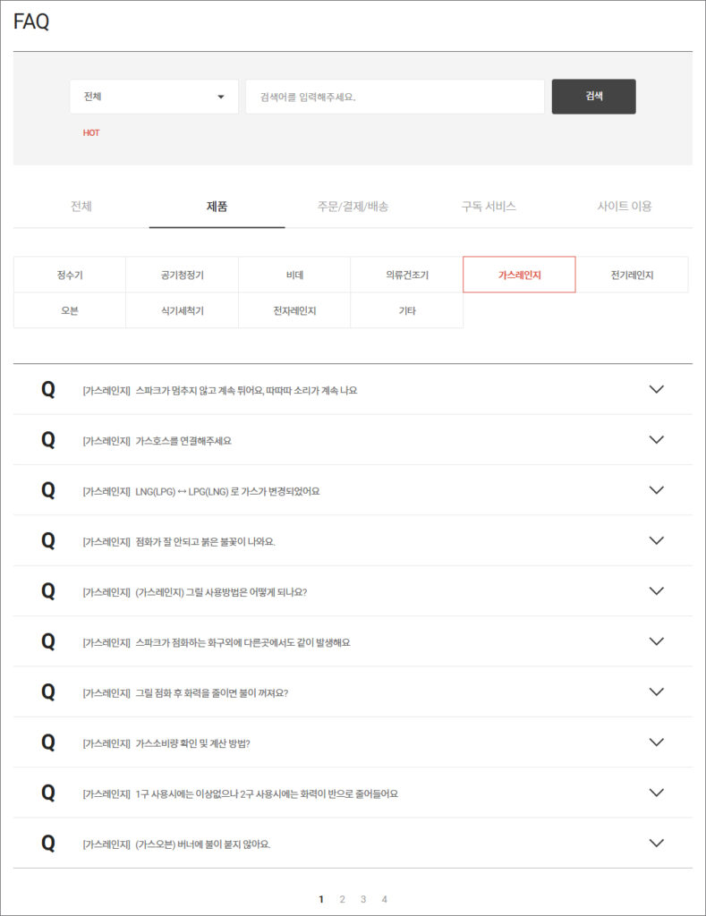 FAQ는 자주 묻는 질문으로 제품> 가스레인지를 선택하면 많은 분들이 궁금해하는 질문에 답변된 목록을 확인할 수 있을 것이며 해당 질문을 클릭하면 답변된 상세 내용을 볼 수 있어 도움 되실 거예요.