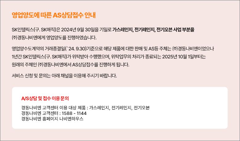 이후 1년간 위탁업무를 수행했지만 2025년 10월 1일 종료되어 원래 주체인 (주)경동나비엔에서 AS상담접수를 진행할 수 있게 바뀌었으니 착오 없으시기 바랍니다.