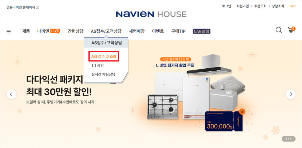 전화가 아닌 다른 문의로 온라인 A/S접수 방법이 궁금하신 분들은 나비엔 하우스 홈페이지에 들어가서 접수하실 수 있는데요.