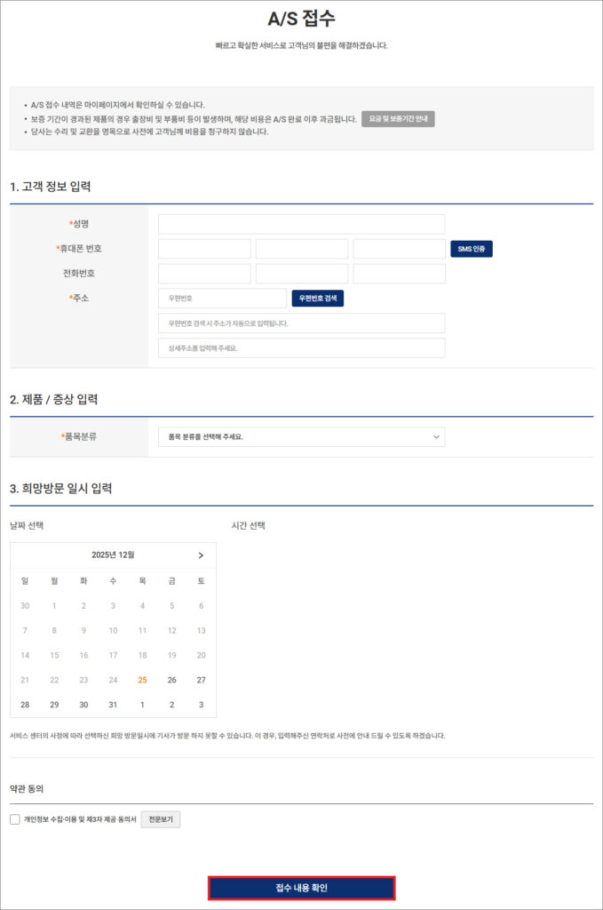 A/S 접수 화면이 나오면 고객 정보, 제품/증상, 희망방문 일시를 입력하고 약관 동의 항목 선택 후 [접수 내용 확인] 버튼을 누르면 됩니다.